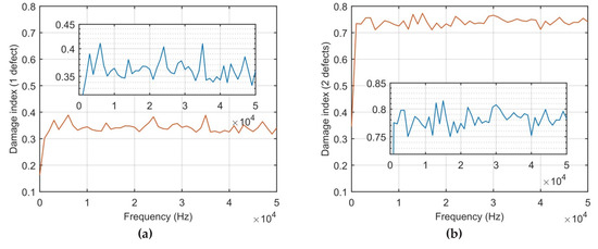 Based on the results of the DI for case 1 and 2 compared to the undamaged structure, it can be observed that the DI for each damaged case has different states. The composite plate with two defects has approx. two times bigger mean value of the DI in comparison with case 1 (when one defect has occurred). Moreover, the DI values with respect to frequencies show the ratio of the FRFs obtained from damaged structure and undamaged structure. The frequency range of the DIs’ calculations is up to 5 kHz in order to avoid the system noise influence and high order modes that are not informative.