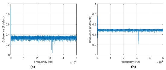 The coherence functions of the case 1 and 2 measure the correlation between the output signal and the input signal at each signal. It is well-known that the maximal value of coherence equals 1 when the output is caused only by the input. In case of the plate structure damage, the coherence is much less than 1 since the damage influences on the structure’s dynamic behavior. The influence of the defect numbers together with input (impact force) signal on the output signal is observed in coherence relationship. These coherence functions are calculated for the impact force-time responses for the given impulse force-time durations of 9.5 × 10−5 s.
