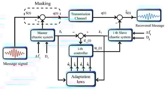The idea of utilizing adaptive control for synchronization is proposed in [32]. The master and slave chaos systems discussed in this work are of the memristor type. Additionally, to enhance the security of information, an unknown parameter in the slave system is applied. The most significant contribution of this scheme is that it is simple to implement, and it helps to achieve valuable results in secure communication applications.