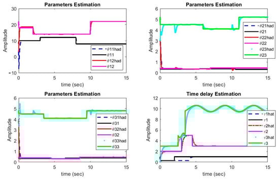 Therefore, the system stability is proved. Additionally, the convergence of synchronization errors to zero in the presence of time delay, uncertainty, and disturbance is guaranteed. The update rules for delays estimation, disturbance bounds, and uncertainty are as follows
