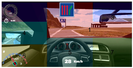 Each driver made the same route in our driving simulator in the research laboratory twice: first using a screen as the visualization display and another time using Oculus Rift as the visualization display. We decided that users would use Oculus Rift the second time they drove on the route. With VR devices such as Oculus Rift, simulator sickness has been reported that could force users to withdraw from the experiments [32]. Consequently, users were asked to drive the second time using the Oculus Rift. In any case, no user suffered from simulator sickness in the experiments and thus all the users were able to finish the experiments. Each of the seven regions of interest of the scene was colored differently to the surrounding regions and identified with a printed number to make the participants as easy as possible to say the region they are gazing at, which is necessary to test the implemented methods. The color of the regions and the size and position of the numbers were carefully selected to ease the identification of the regions without compromising the driving performance. Figure 6 shows the numbered regions. Figure 2 shows the regions numbered and colored as the drivers gazed at them in the experiments. Regions 1, 2, and 4 were colored reddish, violetish, and greenish, respectively. Regions 6 and 7 were colored yellowish. Each user had to complete a calibration stage for each method and device, which was explained in the previous section together with the explanation of each implemented method. In the calibration stage, the training set utilized to configure the method was created. After that, the user had to drive on the route and had to say out loud the number of the region that was gazing at every time a red square appeared in the middle of the screen. That red square appeared every 4 s on the screen during the simulation route. The drivers were asked to gaze at the different scene regions in a natural way and according to the requirements to drive safety on the simulator route. To react properly to the road, traffic signs, road traffic, and other events present on the route properly, they had to gaze at the different representative regions in which we divided the scene. When the drivers were required to say the region they were gazing at, they may make a gaze displacement to focus on the digit to make sure that they said the region they were gazing at before. Besides, the researcher who was annotating the region said by the driver and also the region given by our approach, considered the possible delay and gaze displacement between the time the driver was asked to say the region he/she is gazing at and when he actually said it as this probably implicated that the driver had to gaze at the number of the region. In this case, the researcher annotated the region given by our approach previously to the gaze displacement. From the feedback given by the drivers after the experiments, we also have to mention that, in the calibration stage, the drivers were familiarized with the position and number of the different regions and somehow learned that information. Therefore, they drove naturally on the route and said the scene region easily and without interfering on the driving. On the bottom left part of the screen below the left mirror, the region detected by the module is written so that we wrote it down each pair of regions for a processed frame: the actual region that the driver is gazing at and the region detected by the module. Figure 8 shows simulator scenes with the seven considered regions and the number of the region detected by the Kinect-based gaze region estimation module printed in white below the left mirror.