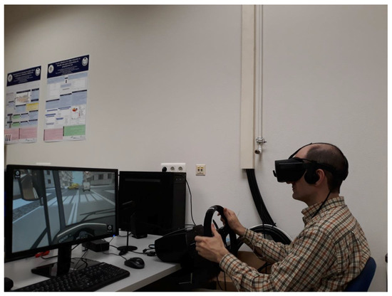 Virtual reality (VR) is common in video games and is increasingly present in other areas such as education and medicine [30]. VR can easily model a whole world in order to be used in teaching experiences immersing the user in its environment. Moreover, the new virtual reality techniques and devices achieve more immersive and realistic environments. Regarding teaching experiences, learning driving skills is undoubtedly a powerful application of virtual reality. Particularly, young drivers with limited experience can commit driving mistakes leading to fatal accidents. These young people are accustomed and receptive to new technologies such as virtual reality, through which they can be exposed to driving events in a safe and reliable environment. They can gain remarkable driving experience and raise awareness of the potential consequences of driving mistakes in order to change their dangerous behaviors. The inclusion of virtual reality devices (head mounted displays (HMD)) in driving simulators makes a difference. They have been adopted by most of the largest automotive manufacturers [31]. The great level of involvement and immersion provided by the latest HMDs can lead to a more natural interaction in a driving simulator, thus research on driver or even pedestrian behavior can benefit from them. Deb et al. [32] developed a pedestrian simulator with the Vive virtual reality device (HTC, New Taipei, Taiwan). Their simulator was successfully tested in a pedestrian crossing as it monitored the pedestrian behavior using head tracking and participants ranked it high in terms of usability and realism. Some VR devices can accomplish not only head tracking but also eye tracking. For instance, HTC Vive Pro Eye includes Tobii Eye Tracking Technology and HTC Vive Headset includes Pupil Labs Eye-Tracker add-on. However, Clay et al. [33] used the HTC Vive Headset and stated that it has to be calibrated and validated properly and that accuracy can vary depending on the eyes (e.g., bright eyes are better than dark eyes).