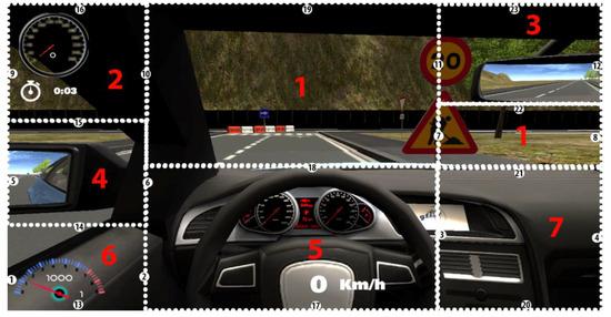 We will use numbers 1 to 7 to refer to these regions throughout the paper. It was very important to take a good decision about the number of scene regions as it is necessary to distinguish among all the regions that the driver is going to gaze for a different purpose but taking into account that the larger the number of regions is, the worse the gaze region estimation performance is. Many research studies used similar gaze regions both in simulation and on-road studies with small differences to adapt to the particular environment and FOV [43,44,45,46]. For instance, Thorslund et al. [43] selected seven quite similar gaze regions in a driving simulation research study, including windshield, left, rear-view mirror, speedometer, secondary task display, and other (region with objects not included in the other regions). Vora et al. [44] considered six quite similar regions, including forward, left, center stack, rear-view mirror, and speedometer, in an on-road experiment to analyze the performance of a gaze region estimation approach using convolutional neural network.