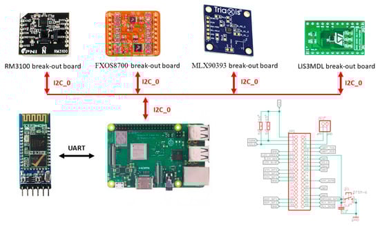 To be able to test all sensors under the same conditions, particular break-out boards of the respective sensors were purchased. A break-out board makes it easy to use a single electrical component when adding the pins to the small package of magnetometer what allows connecting the board to a higher circuit. This makes it relatively easy to use. We decided to use RaspberryPi 3 Model B+ as the control board for setting up the sensor parameters, to start/end measurements and to store measured values in SD card. For this purpose, a special shield was designed and developed for RaspberryPi (see Figure 1 and Figure 2).