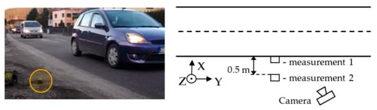 Measurements were taken between 16:45 and 17:30. We set the duration of both measurements so that the number of captured vehicles is approximately 100. For evaluation, passing vehicles were also recorded by a camera (with a frame rate of 24 fr/s). Figure 3 shows the location of the sensors during the measurements, the orientation of the axes relative to the road, and the location of the camera. The picture also shows a view of the measuring set.