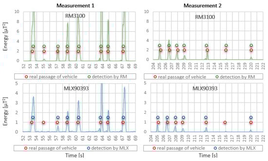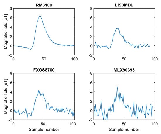 In order to compare the performance of sensors in vehicle detection, an algorithm based on the evaluation of the measured signal energy transition over a threshold value was used. The X-axis signal was used for evaluation. During preprocessing the DC component was removed from the measured signal and the noise was suppressed by a low-pass filter. Only the RM3100 sensor has not any offset. The worst in terms of preprocessing is the LIS3MDL sensor, whose offset seems to “float”. For the other sensors, the offset was a linear function of time.