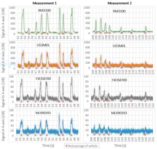 From the records in Figure 5, it is possible to observe a significant influence of the quality of the used sensor (sensitivity and intrinsic noise) and the distance of sensors from the road (measurement 1 versus measurement 2). Significantly higher deformation of the Earth’s magnetic field caused by real passage of vehicle was recorded by RM3100 and LIS3MDL sensors, and it is about 10 times higher in comparison with deformations obtained by FXOS8700 a MLX90393 sensors. The recorded deformation of magnetic field is reduced about half by moving all sensors by 0.5 m. Displayed results confirm that the RM3100 sensor is the best and the MLX90393 sensor is the worst of the tested magnetometers. The red dots in the figure mark the passing vehicle.