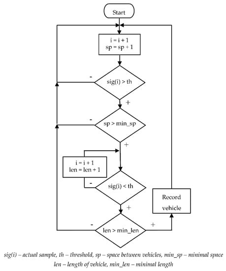 The algorithm is based on the detection of the signal crossing over one threshold value. Therefore, the input signal must be non-negative (e.g., signal energy). When evaluating the signal, we considered the real properties of the vehicles and the traffic itself, namely the length of the vehicle and the gap between the vehicles. The length of vehicles is usually greater than 4 m. This, at a speed of 50 km/h (the municipal speed limit in Slovakia) and a sampling frequency of 100 Hz, represents approximately 29 samples per vehicle. The same goes for the gap between vehicles. We tested different settings for both parameters and selected the settings that achieved the best results. In one case the minimum vehicle length was 14 samples and the sample gap 21, in the other case the values 30 and 60 were used. The basic principle of the detection algorithm is shown in Figure 6. The algorithm assumes input signal with removed noise and zero offset.