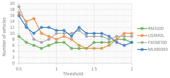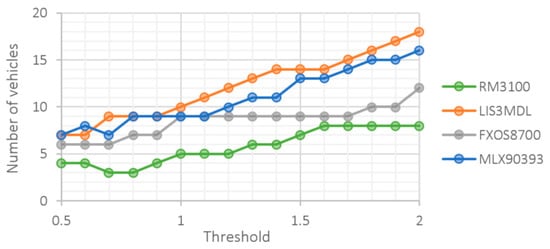 Comparing Figure 9 and Figure 10, we see that sensors achieve the best results at different threshold levels. A trade-off needs to be made between the sensor’s ability to detect vehicles and the number of false positives. In this respect, the RM3100 sensor is again the best. The detection ability of this sensor is not as sensitive to the level of the threshold as it is for other sensors. This allows to choose a threshold value that is optimal in both respects.