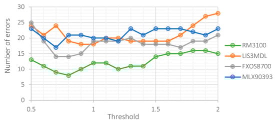 Figure 10 shows the dependence of the number of false positives on the size of the threshold value. Due to the higher noise of the LIS3MDL, FXOS8700 and MLX90393 sensors, frequent false detections occur at low thresholds.