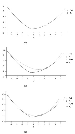 Majorization-minimization (MM) procedure: (a) cost function F(x) to be minimized and initial xo; (b) iteration 1 where majorizer G0(x) is tangent to F(x) at x0 and minimize G0(x) for x1; (c) iteration 1 where majorizer G1(x) is tangent to F(x) at x1 and minimize G1(x) for x2.