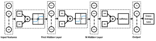 In training the algorithmic model, the initial weight (W) and bias (B) (i.e.,), were random. In feedforward, hyperbolic tangent function (tanh(z)) was the activation function between hidden layers, as shown in Equation (6) where tanh(z) = [−1,1]. The output layer used softmax(z) as the activation function for classification based on probability, as shown in Equation (7) and the linear combination, as shown in Equation (8).