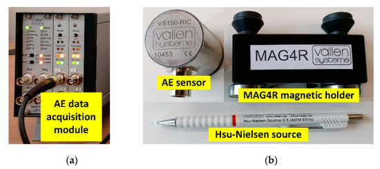 AE data sensor and acquisition: (a) AE data acquisition module; (b) AE sensor, MAG4R magnetic holder, and Hsu–Nielsen source.