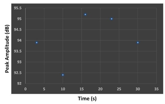 Figure 6 illustrates the peak amplitude (dB) of the AE sensor relative to time (s), and the results are tabulated in Table 2. In Figure 6, the maximum peak amplitude of the experimental AE sensor was greater than 80 dB (>80 dB), indicating that the AE sensor could be deployed to capture the AE signals of cracks in the steel rail.