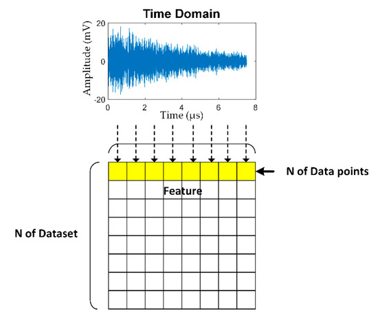 In this research, one AE signal contains 300,000 data points, and the time to capture one data point is 0.05 µs, given fs = 20 MHz. As a result, the time required to capture one AE signal (i.e., 300,000 data points) is 0.015 s (= 300,000 × 0.05 × 10−6).