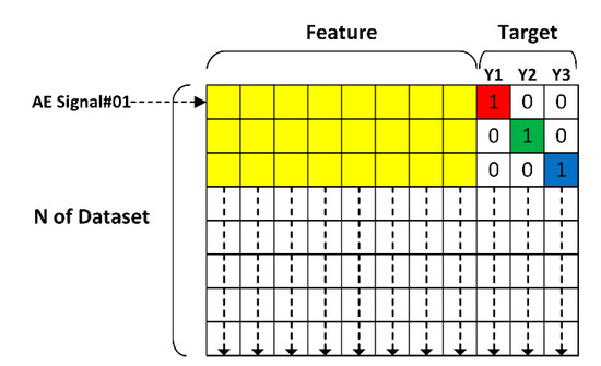 In Figure 10, one row of yellow grid cells represents one AE signal (300,000 data points), and the total number of rows (i.e., N of Dataset) represents 450 AE signals (PLB digital signal data = 450 signals) at the rail head, web, and foot. In the columns “Target”, the rail head, rail web, and rail foot are represented by red, green, and blue colors, respectively.
