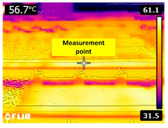 Given the operating temperature range of −40 to 85 °C of the experimental AE sensor, the temperatures of steel rail around mid-day were measured by using a thermal imaging camera (FLIR, USA.) prior to the installation of the AE sensor. The steel rail temperatures were 56.7–61.1 °C, as shown in Figure 14. The steel rail temperatures were within the operating temperature range of the AE sensor.