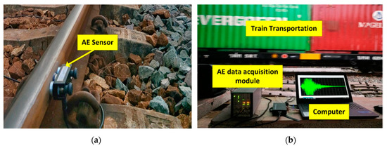Figure 5a shows the AE data acquisition module with 16-bit ADC and a sampling rate of 20 MHz (Vallen AMSY-6). Figure 5b illustrates the AE sensor (S/N 10453) with 80 kHz–500 kHz bandwidth and −40 °C to +85 °C operating temperatures (Vallen model VS150-RIC). The MAG4R magnetic holder was used to attach the AE sensor to the steel rail (on the field side of the rail head).
