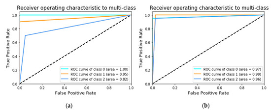 Receiver operating characteristic (ROC) curve where classes 0, 1, and 2 denote rail head, rail web, and rail foot: (a) 150 AE signals (first grouping); (b) 300 AE signals (second grouping).
