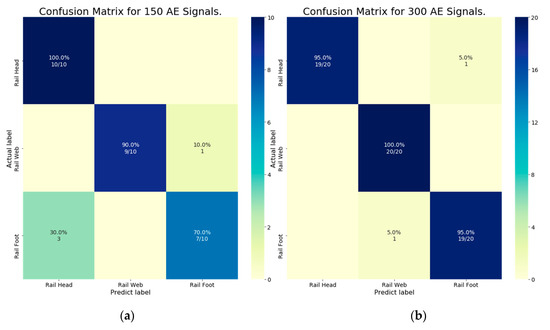 Confusion matrix of the deep learning algorithm for classification: (a) 150 AE signals (first grouping); (b) 300 AE signals (second grouping).