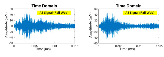 Figure 8a–c shows the un-denoised AE signals (prior to pre-processing) of PLB at the head, web, and foot of steel rail. The AE signals of PLB were captured by the AE sensor and converted by the AE acquisition module into un-denoised AE digital signal data prior to pre-processing by total variation denoising (TVD) algorithm to remove the ambient noise.