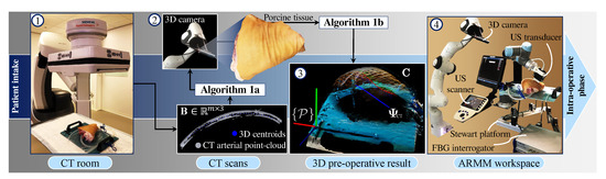 Pre-operative planning for the ultrasound (US) transducer. ① The porcine tissue is scanned pre-operatively with a computed tomography (CT) scanner. The resulting scanning data are converted to a point-cloud dataset (). 3D datapoints (m) are used as input to Algorithm 1, which calculates a set consisting of n arterial centroids () ② A second point-cloud () is obtained from a 3D surface scan of the tissue and used as input to the Algorithm 2, the ultrasound pose planner. ③ The output is visualized as a set of poses consisting of projected surface via-points () and orientations (). ④ Finally, in the Advanced Robotics for Magnetic Manipulation (ARMM) workspace, a US sweep can be performed across the tissue, followed by multi-modal feedback of the 3D artery, tissue surface, and the Fiber Bragg Grating (FBG)-embedded catheter in the intra-operative phase.