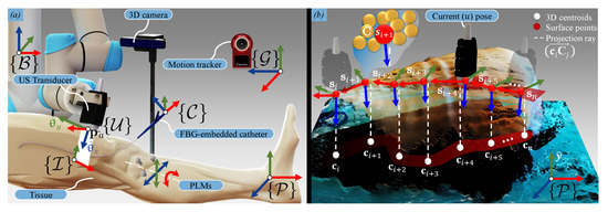 This study is performed in the Advanced Robotics for a Magnetic Manipulation (ARMM) system [32]. The framework discussed in this study is implemented on the ARMM workstation (Precision Tower 7910, Dell Technologies, Austin, TX, USA) running Ubuntu 18.04 (Kernel 4.4.236) and an RT-PREEMPT patch for real-time visualizations. A Point-Cloud Library (PCL) package (Willow Garage, Menlo Park, CA, USA) is used for the 3D rendering of point-clouds, while OpenCV (Open Source Computer Vision Library, v.3.4.2) is used for image processing. The modalities used in this study are as follows: A 6 degree-of-freedom (DoF) serial-link robot (Model UR5, Universal Robots, Odense, Denmark) is used to maneuver a linear US L14-5 transducer connected to a SonixTouch Q+ US scanner (BK Medical, Quickborn, Germany). Furthermore, a passive robot (Panda, FRANKA EMIKA GmbH, Munich, Germany) is used to hold and adjust the pose of a 3D depth camera (Intel Realsense SR305, Santa Clara, CA, USA). The depth camera reconstructs a 3D point-cloud structure of any surface at a rate of 60 Hz, and the transducer captures and streams 2D US images at a rate of 30 Hz. Motions of the catheter and tissue inside the ARMM workspace are recorded by an Optitrack Flex13 (NaturalPoint Inc., Corvallis, OR, USA) infrared precision sphere-based motion capture system. The endovascular catheter shaft is embedded with an optic fiber containing FBG sensors and connected to an FBG-Scan 804D interrogator (FBGS Technologies GmbH, Jena, Germany). These sensors provide 3D catheter reconstruction in a real-time environment.