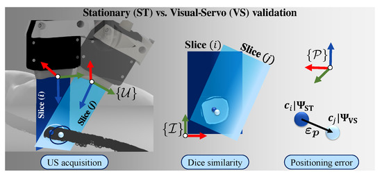 Calculating the reconstruction accuracies: The US images are paired as slices pertaining to each via-point on the skin surface in the transducer frame (). Dice similarities are calculated between stationary (ST) US slices and dynamic slices captured during the visual-servo (VS) trial, both in the image reference frame (). Finally, the 3D Euclidean errors () are calculated, using the centroids () of each slice () as reference point in frame ().