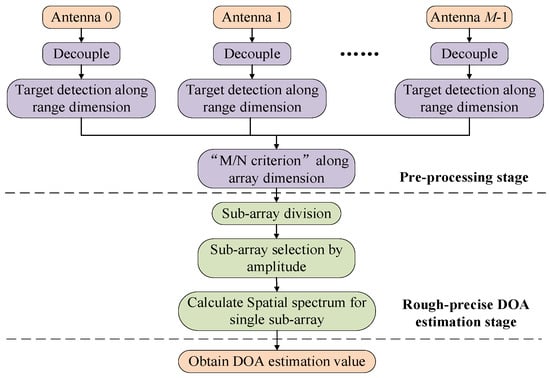 Figure 2. Firstly, the specific steps in the pre-processing stage are introduced, including multi-target information decoupling and target detection. Then, the detailed algorithm of the DOA estimation stage is introduced, which includes a rough DOA estimation and a precise DOA estimation by using the amplitude and phase information of the target on each antenna. Finally, the computational complexity of two-stage fast DOA estimation algorithm is analyzed.