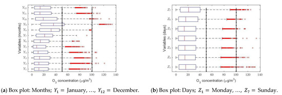 In order to summarize the observations, Table 1 shows some summary statistics. In addition, Figure 2a shows a multiple box plot of the variables , . In this figure, a separation between air pollution levels due to O3 concentration in Quito [23] is made by using dashed vertical lines. These levels in are as follows: Desirable = ; Acceptable = ; and Caution = [).