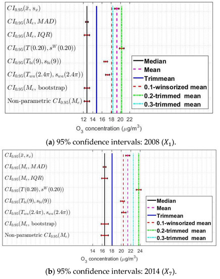 The limits of the confidence intervals are shown in Table 2, and Figure 4 shows a graphical representation of these intervals. From the analysis of Table 2 and Figure 4, we see that no trend in the concentration of O3 is clear. It can be seen that there were three years, 2008, 2011, and 2017, that seemed to have lower O3 concentrations. However, there is an overlap of intervals with all the years, with two exceptions: 2015 and 2019. These two years have higher O3 concentration levels than the rest of the years, especially 2019. In addition, 2015 and 2019 are different from each other. On the other hand, the widths of the confidence intervals have no significant differences. Moreover, it is verified once again that the desirable level of air pollution [23] was exceeded.