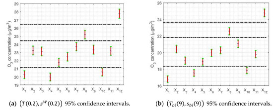 Figure 5b shows that, when analyzing the weeks, the concentration of O3 increased notably on the weekends and continued to decrease on weekdays. In this case, the WSRT and the nonparametric intervals yielded the same results. Furthermore, the width of the nonparametric confidence intervals was directly proportional to the value of the median.