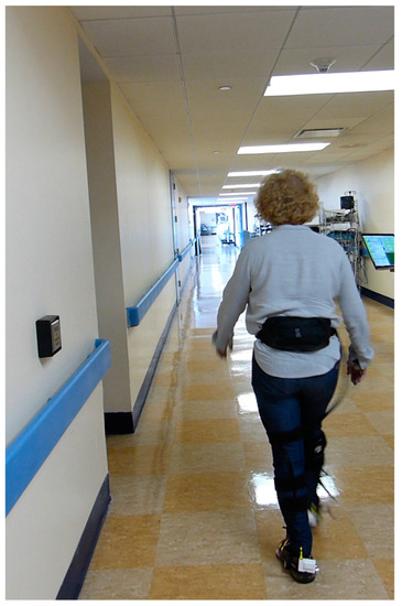 Participant walking while wearing custom-engineered footwear developed in the Columbia University Robotics and Rehabilitation Laboratory. Each participant completed a 100-m-long course.
