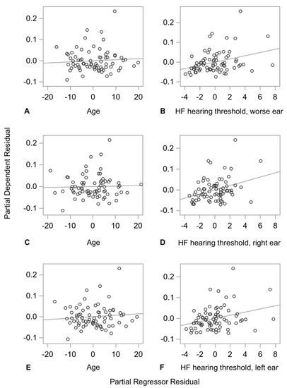 The DSP CV (Table 3) increased by 1.022 (p < 0.01) and 0.759 (p < 0.01) percentage points with every 10 dB increase in high frequency hearing thresholds in the right ear and the left ear, respectively; this increase was greater for increases in the right ear high frequency PTA. All standardized coefficients for the high frequency hearing thresholds were greater than the standardized coefficients for age in the same model, suggesting that the predictive ability of high frequency hearing loss for DSP CV is stronger than that of age. Figure 2 shows the partial regression plots for DSP CV for age and high frequency hearing thresholds for the poorer hearing ear, the right ear, and the left ear.