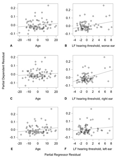 The DSP CV increased by 1.114 (p = 0.0006) percentage points with every 10 dB increase in low frequency hearing thresholds in the right ear, but not the left ear. The standardized coefficients for the low frequency hearing thresholds of the poorer hearing ear and the right ear were greater than the standardized coefficients for age in the same model, suggesting that the predictive ability of low frequency hearing loss for DSP CV is stronger than that of age. Figure 3 shows the partial regression plots for DSP CV for age and low frequency hearing thresholds for the poorer hearing ear, the right ear, and the left ear.