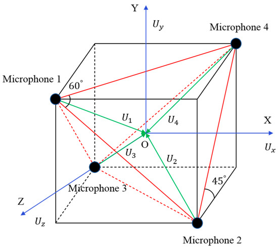 The four microphones of the three-dimensional sound intensity probe were placed at the four vertices of a cube [18], as shown in Figure 1. First, we calculated the sound intensity components from the center of the cube to the vertices where the four microphones were located according to the dual-microphone cross-spectrum method. Then, we performed vector calculations according to the geometric characteristics of the cube and obtained the sound intensity components in the X, Y, and Z directions of the center point of the cube [19,20].