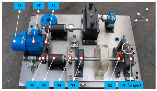 As shown in Figure 3, the sound sources on the test bench included motors, pulleys, couplings, and various support bearings. The vertical distance between the probe and the transmission shaft plane was 500 mm. Since the distance between the center of the nine sound sources and the test point was more than two times the maximum geometric size of the sound sources, the nine sound sources were all regarded as point sound sources. The spherical coordinate system was set up with the axial position of bearing seat I (S1) as the origin. The specific information of the sound sources is shown in Table 2.