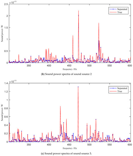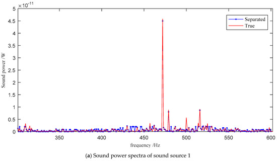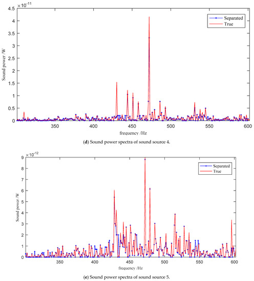 Since the one-dimensional sound intensity probe was close to the sound source and pointed to the sound source, the influence of other sound sources can be ignored according to the characteristics of sound intensity. Based on the point sound source hypothesis, the sound power spectrum of each sound source can be obtained referring to Equation (9). This sound power spectrum is taken as the ground truth to verify the proposed method.