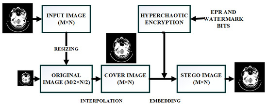 The presented reversible EHR embedding based on an HC encryption and IP algorithm has been discussed in this section. An image IP algorithm is used to achieve the reversibility of the actual up-sampled image. This technique can be efficiently used to construct a CI from the original (ORG) clinical image that can be represented by Equations (1)–(4). The proposed technique is illustrated in the following sub-sections. Section 3.1 describes the detailed process of the IP technique for CI formation. The IP technique can provide high embedding capacity along with the generation of better visual quality. Section 3.2 describes in detail Chen’s HC system employed to generate the PRN sequence. A PRN sequence is generated and is utilized to encrypt the EHR data and the authentication logo. Both the EHR and the fragile WM (logo) are implanted into the interpolated CI. The EHR and WM bits are embedded with the help of the spatial domain algorithm called the least significant bit (LSB) substitution technique. Further, Section 3.3 and Section 3.4 respectively deal with the process of data embedding and data reconstruction.