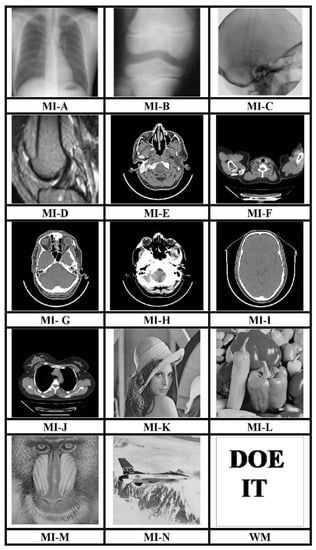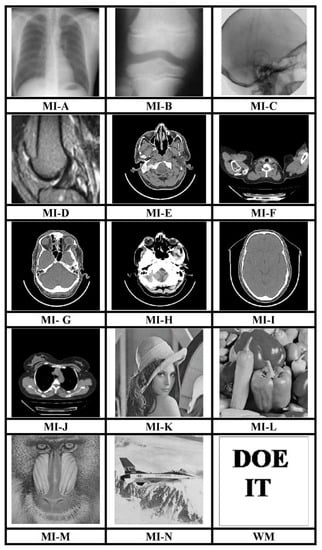 The MATLAB R2017a platform has been utilized for carrying out the experimental investigations for different gray-scale natural and MI. Both types of images that have been used for testing have dimensions 512 × 512. We have conducted experiments using a 64-bit Windows 10 Operating system with an i5 processor, 8 GB RAM, and 2.40 GHz clock speed. The different images, as well as a logo as WM, have been represented in Figure 3. The binary WM employed for authentication purposes has a 128 × 128 size. The technique is evaluated for a payload of 196,608 bits or 0.75 bits per pixel (bpp). The scheme reports an average encryption speed close to 1Mbps. The image quality metrics applied for evaluation of the scheme include normalized cross-correlation (NCC), peak signal to noise Ratio (PSNR), and structural similarity measure index (SSIM) [16,17,18,19,20]. In-depth analysis has been performed, which includes imperceptibility analysis, computational complexity analysis, and fragility analysis. Furthermore, a detailed comparison of many contemporary techniques has been described. Furthermore, the fragility analysis carried out reveals that the WM is fragile to all possible attacks and can easily detect tampering of data.