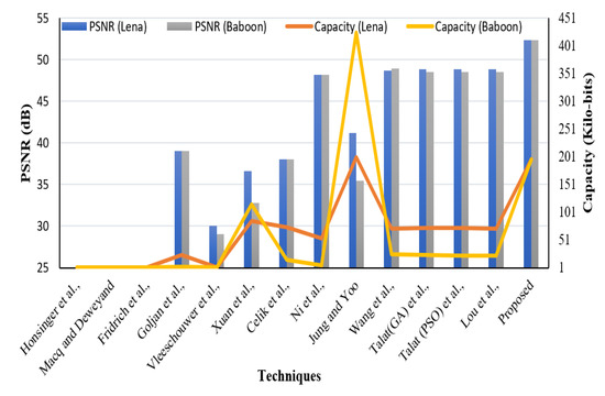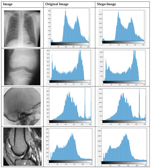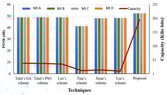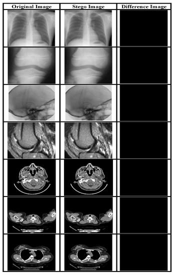 The payload is a critical underlying requirement of a data hiding system. The perceptual quality of the SI is evaluated using subjective and quality metrics like PSNR and it is a direct function of payload. In our proposed system we have embedded two types of data in the CI obtained using a novel IP method: EHR and watermark. Both types have been embedded using the LSB approach. The visual quality of the SI yielded by the embedding method is evaluated based on objective as well as subjective analysis. Figure 5 presents various original and Stego-MIs with a payload value equal to 0.75 bpp. The generated SI’s quality is much superior, along with high payload value. Furthermore, to validate the described RDH method a comparison has been made with contemporary works mentioned in [44] as shown in Figure 6 and Figure 7.
