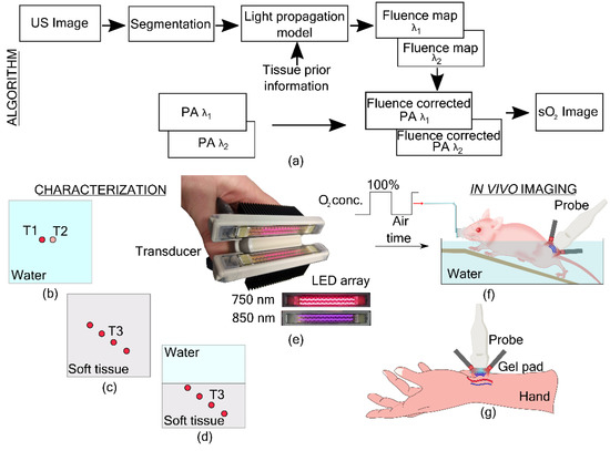 Algorithm and experimental setup. (a) Fluence compensation algorithm using ultrasound information. Schematic of the imaging plane in the photoacoustic oxygen saturation (PA sO) characterization experiments (b–d). (b) PA sO imaging of tube 1 (T1) having constant sO against T2 with varying sO. (c) PA sO imaging in soft tissue-mimicking medium with tube T3 imaged at four different depths. (d) PA sO imaging in medium with two optical properties, water on the top and soft tissue-mimicking medium at the bottom. (e) LED-based photoacoustic probe with an ultrasound transducer and LED arrays of two wavelengths (750 and 850 nm). (f) In vivo imaging of a mouse with cyclically changing oxygen concentration in the breathing air. (g) In vivo imaging of an artery and a vein in the wrist of a human volunteer.