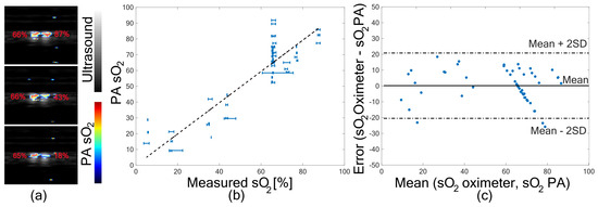 Validation of PA sO imaging is presented in this section to analyze the accuracy of the two-wavelength PA sO against a ground truth method. Figure 2a shows two tubes having blood with three different levels of oxygen. Oximeter readings are marked next to the tubes, and the difference in oxygen saturation is visible in the PA sO images. To quantify the changes in oxygen saturation and validate it with oximeter readings, PA sO in a region of interest of the tubes are compared in Figure 2b. The graph shows the PA estimated sO against the measured oxygen saturation. sO readings before and after imaging are indicated by the error bar in the measured sO. A linear fit to the data is shown with the dashed line. The correlation coefficient (r) between measured sO and PA estimated sO is (p < 0.001), which shows that the two measurements are linearly correlated. The error in the PA estimated sO, given by the difference between the two methods is plotted in Figure 2c. A mean error of and a standard deviation of was observed. Most of the error values are around the mean, and of the values are within the Mean ± 2SD region, indicating that the variations are from the noise in the PA measurements.