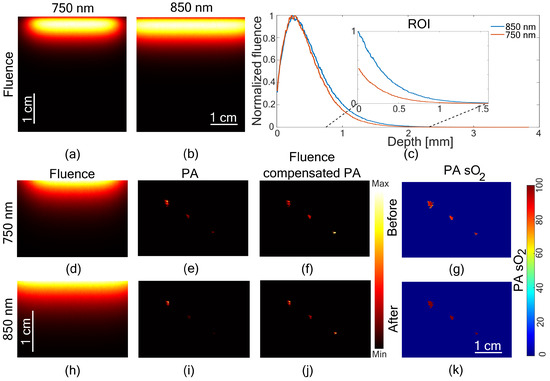 In the second experiment, a homogeneous phantom was considered with soft tissue optical properties (Table 1). Fluence for both 750 and 850 nm is shown in Figure 3. The peak fluence can be observed at the LED locations in Figure 3a,b. Due to the advanced position ( mm) of LED arrays on the sides of the transducer, this region in the imaging plane cannot be used for imaging tissue. We only considered the imaging plane below the LED position as the region of interest (ROI). Figure 3c shows a normalized line profile through the fluence map for the entire imaging plane and in the ROI. Figure 3d,h shows fluence map at 750 and 850 nm, respectively. Figure 3e,i shows the PA images of the same tube with blood at different depths at 750 and 850 nm, respectively. Figure 3f,j shows fluence compensated PA images. PA images show the signal from the tube located at three depths. With fluence compensation an enhancement in the PA signal from deeper locations is visible. Figure 3g shows the PA sO image before fluence compensation and Figure 3k shows PA sO image after fluence compensation.