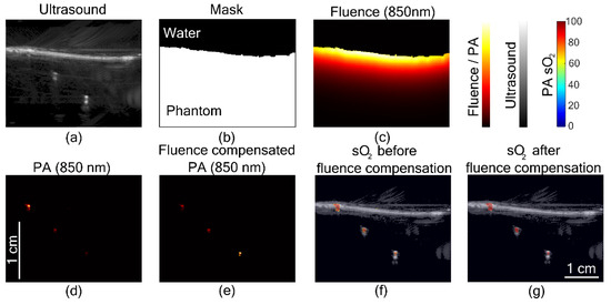 In the third experiment, a two-slab phantom was considered. The upper region was water and the lower region a soft tissue-mimicking phantom. Figure 4a is the US image showing the film separating the two mediums. Figure 4b is the segmented image with ones for soft tissue region and zeros for water. Figure 4c shows the fluence in the medium at 850 nm. The PA image of the tube at three different depths is shown in Figure 4d. The fluence compensated PA image in Figure 4e shows the enhancement at deeper locations. Figure 4f shows the sO image before fluence compensation overlaid on the US image and Figure 4g is sO image after fluence compensation. The enhancement in the PA sO is visible in Figure 4g. The PA sO estimated by taking the mean value for the tube locations before fluence compensation were and , and fluence compensation it was , and . The oximeter readings before and after imaging were and , respectively.