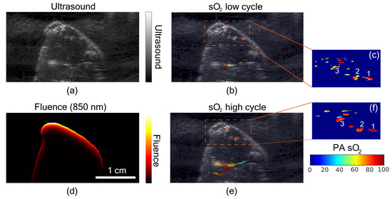 Results from in vivo PA sO imaging on mice thigh muscle is shown in Figure 5. The animal was given two levels of oxygen, switching between normal air and oxygen. Figure 5a shows the US image of the thigh muscle of the mice. The fluence map at 850 nm utilizing the US segmented image is shown in Figure 5d. Figure 5b,e show fluence compensated PA sO images corresponding to the normal air (low cycle) and oxygen (high cycle), respectively. The zoomed-in region from both low and high cycle is shown in Figure 5c,f, respectively. The difference in sO images is clear between normal air and oxygen. To quantify the change, three regions marked by 1, 2, and 3 in Figure 5c,f were analyzed for the mean PA sO values. During the low cycle PA sO values were and , respectively, for regions , and 3 and it changed to and during high cycle.