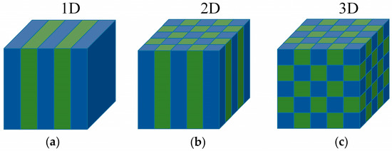 Photonic crystals, first proposed by Yablonovitch in 1987, are a medium with a periodic distribution of the refractive index (RI) in space [1]. According to the periodic arrangement of the constituent medium, photonic crystals can be classified into three structure types: one-dimensional (1D) (e.g., fiber grating), two-dimensional (2D), and three-dimensional (3D) [2], as shown in Figure 1.