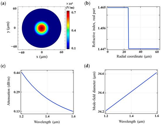 In this paper, the physical parameters of the HC-PCF electromagnetic field were calculated using the wave optical module in the COMSOL Multiphysics software package (COMSOL Inc., Stockholm, Sweden). The fundamental mode of HC-PCF has an electromagnetic field mode similar to the standard step fiber. Figure 2 shows the mode field distribution and characteristic simulation diagrams of the step fiber. The parameters of the step fiber manufactured by Thorlabs (Newtown, NJ, USA) were defined as follows: the core diameter was 50 μm and the cladding diameter was 125 μm; the inner core was made of pure silica glass with nco to 1.4457, and the outer layer was coated with cladding material with ncl to 1.4378. The working wavelength of this step fiber was 1200–1600 nm.