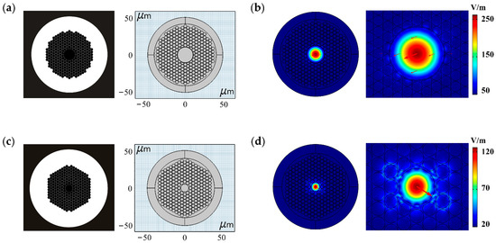 Finite element modeling and simulation results of HC19-1550 and HC-1550-02. (a) The cross-sectional and COMSOL simulation modeling schematic diagrams of HC19-1550. (b) The mode field diagram of HC19-1550 end-face and the enlarged diagram of HC19-1550 core area. (c) The cross-sectional and COMSOL simulation modeling schematic diagrams of HC-1550-02. (d) The mode field diagram of HC-1550-02 end-face and the enlarged diagram of HC-1550-02 core area.