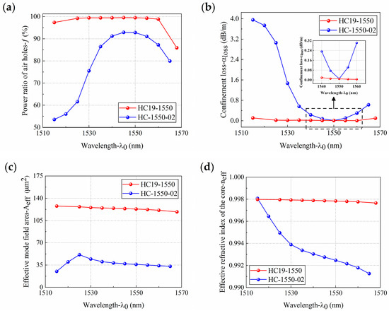 To intuitively reflect the behavior of core optical power, confinement loss, effective mode field area, and the effective RI of HC19-1550 and HC-1550-02 in response to changes in wavelength, numerical calculations were carried out in the communication C-band, which is commonly used in sensing (Figure 4).